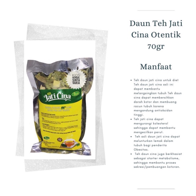 Jati cina memiliki bunga berwarna kuning dan daunnya memiliki banyak manfaat bagi kesehatan. Teh yang dikemas dalam kemasan 40 gr ini memiliki banyak sekali manfaat, seperti melangsingkan tubuh, melunturkan lemak, dan mengurangi kolesterol. Teh jati cina adalah minuman herbal yang digunakan sebagai pelangsing dan untuk mengatasi konstipasi. Bagi yang berlebihan berat badan atau kegemukan. Daun jati cina biasanya dikenal dengan daun senna. Membersihkan racun berbahaya dalam tubuh serta menghilangkan sumbatan sampah di usus besar. Teh daun jati dipercaya memiliki efek laksatif yang bermanfaat untuk menangani konstipasi dan menurunkan berat badan. Teh daun jati cina adalah ramuan herbal yang sering digunakan untuk mengatasi sembelit dan bahkan sebagai obat pelangsing. Memiliki manfaat yang banyak membuatnya semakin dikenal banyak orang. Kalau perlu kita ketahui manfaat teh daun jati ini banyak manfaat dan banyak khasiatnya. Manfaat yang selanjutnya adalah membantu melancarkan sistem pencernaan. Teh daun jati cina hikmah adalah teh yang diproduksi oleh cv cahaya rejeki. Teh jati cina atau jenis jati tiongkok biasa digunakan sebagai pengobatan herbal.