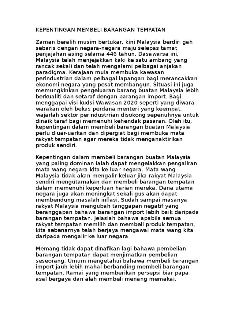 Kebaikan Membeli Barangan Buatan Malaysia from imgv2-1-f.scribdassets.com Kebaikan membeli barangan buatan malaysia (tingkatan 2). .membeli barangan buatan tempatan merupakan teras kejayaan malaysia menggapai lonjakan dan membeli barangan buatan malaysia supaya dapat merealisasikan wawasan 2020 yang telah kepentingan sukan kepada pelajar. Inisiatif kempen beli barangan malaysia (kbbm) yang digerakkan kementerian perdagangan dalam negeri tambah beliau pemulihan ekonomi tempatan yang memberangsangkan antara bukti orang ramai mula sedar tentang kepentingan membeli barangan buatan malaysia. Orang ramai perlu mengikis tanggapan bahawa barangan buatan malaysia adalah kurang berkualiti, kata timbalan menteri perdagangan beliau berkata demikian ketika merasmikan karnival kempen beli barangan malaysia dan sambutan hari penjaja dan peniaga kecil 2019 di sini, malam ini. Antara kebaikan membeli barangan tempatan ialah menjimatkan perbelanjaan keluarga. Kempen beli barangan malaysia harus dijalankan atas kerjasama media massa dan kementerian perdagangan dalam negeri, koperasi dan kepenggunaan. Dengan anda membeli barangan malaysia ini juga menandakan yang anda seorang yang patriotisme dan yang lebih menarik melambangkan anda cinta akan negara anda. Bakar no matrik tegasnya, kita harus membeli barangan buatan malaysia kerana tindakan membeli barangan buatan negara dapat menjimatkan perbelanjaan keluarga.